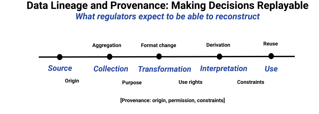 While lineage focuses on movement, provenance focuses on origin and legitimacy. Provenance establishes where data came from, under what authority it was obtained, and for what original purpose. These factors matter because regulatory permission is often tied not to technical access, but to intended use.
